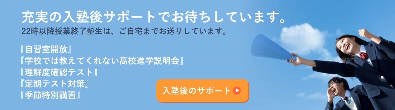 『送り環境』『自由に使える自習室』『理解度確認定期テスト』『定期テスト対策』『季節特別講習』『学校では教えてくれない進学無料相談』、通常の授業フォローだけでなく、目標達成へ強力にバックアップしています。